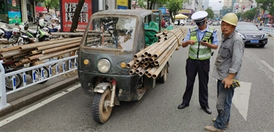??? 本網訊?? 8月3日,一輛三輪摩托車運輸超長鐵管行駛在八一路上,正值上班高峰期,車流量大,車上運輸的超長鐵管極易刮碰到附近的車輛,過往車輛紛紛避讓。執勤的交警將車輛攔下后,對駕駛員進行嚴肅批評教育,并要求其用其它車輛轉運鐵管。(黃義清?何建云)