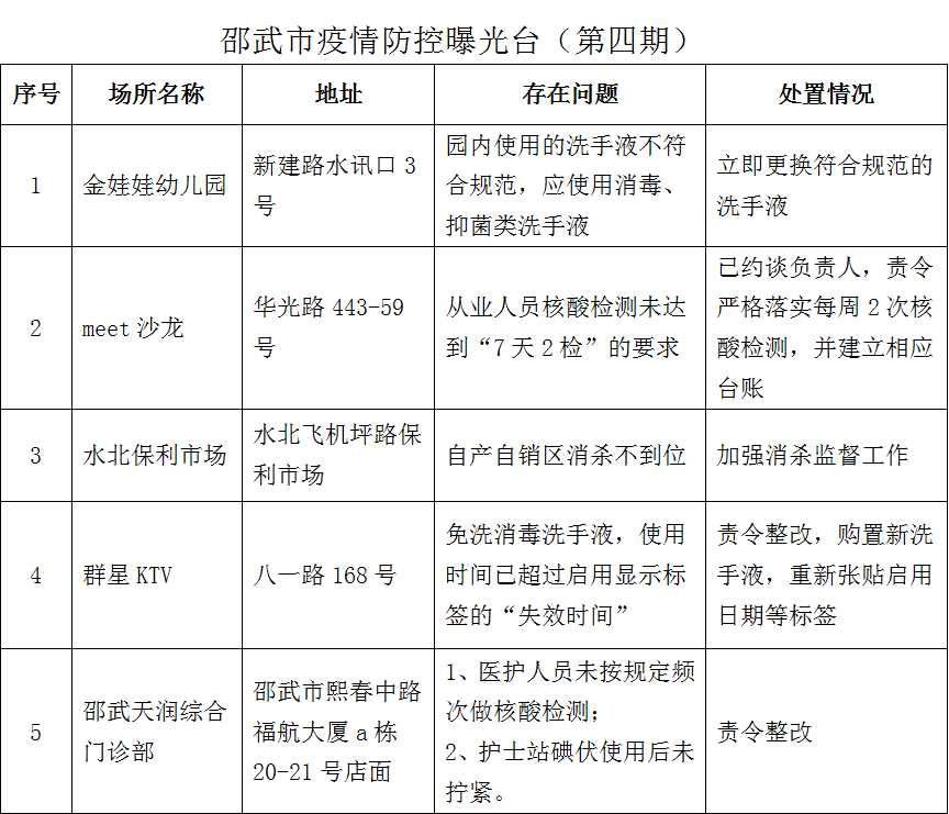 當前疫情防控形勢仍然嚴峻復雜,為進一步壓實行業主體防疫責任,落實疫情防控各項措施,現根據行業主管部門督查情況對我市部分防疫措施落實不到位的經營主體予以曝光。希望廣大市民自覺遵守疫情防控規定,做好個人防護措施,謹慎前往防疫措施不到位,存在疫情傳播風險的被曝光場所消費,切實保護好自己及家人的健康與安全。