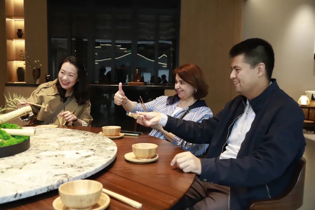 ![]() 烏茲別克斯坦媒體團一行在“竹立方”生態科創館體驗竹制產品(萬琪 攝) 在“竹立方”生態科創館,媒體團一行沉浸式了解了邵武竹產業發展歷程,參觀了全竹產業鏈館、展會展示活動區、竹家居生活體驗區、竹林里超市等主題空間,邵武豐富的竹工藝品、竹家居用品以及獨特的竹文化給媒體團留下了深刻的印象。參訪中,“竹立方”生態科創館特意準備的精致伴手禮——竹鋼筆,受到了媒體團的歡迎。