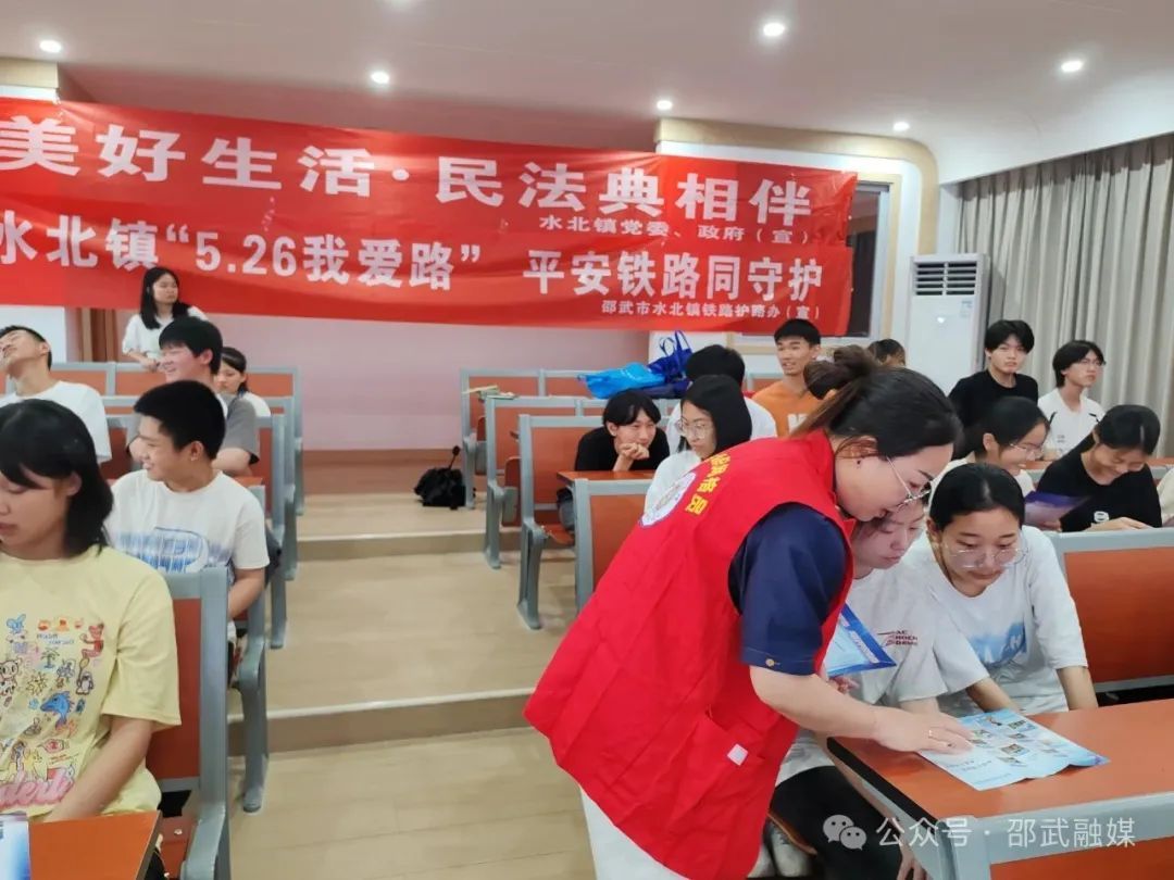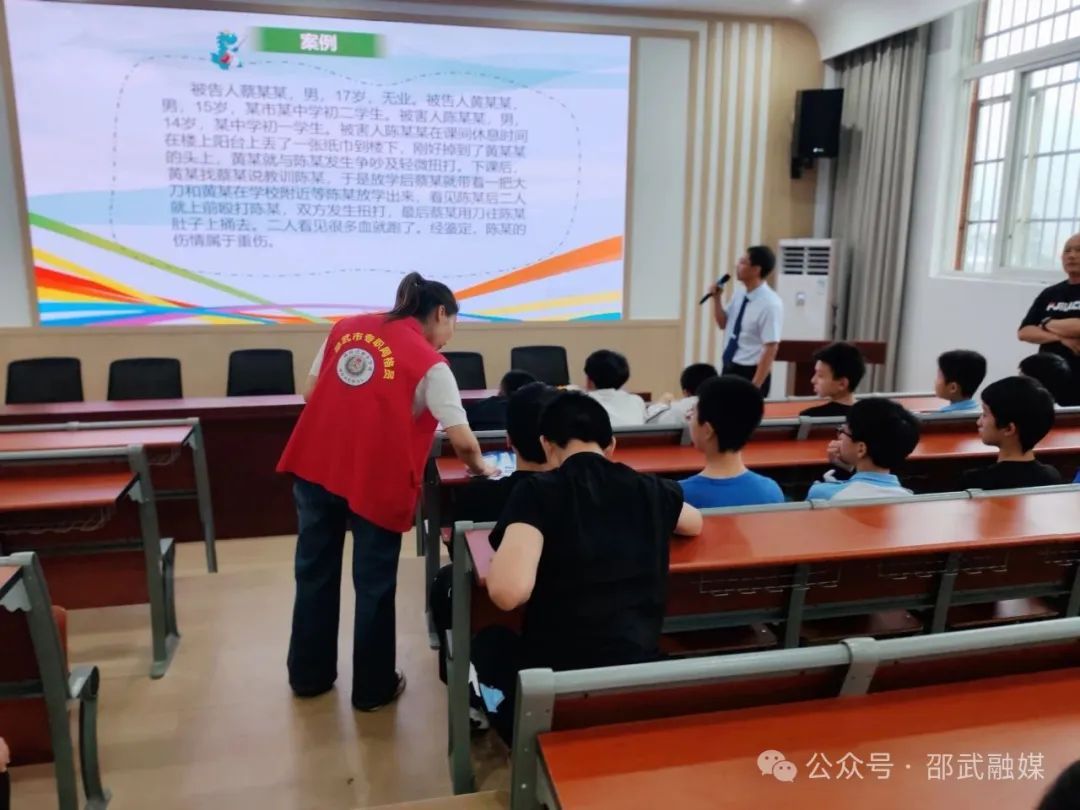 活動現場,水北司法所所長通過圖文并茂的PPT展示,從“什么是校園欺凌”著手,引導學生認識校園欺凌的多種表現形式,用親身經歷的事例,以案釋法,告訴學生如何遠離和應對校園欺凌,教育學生不做受害者、不做欺凌者,勇敢對欺凌者說“不”。針對學生中可能出現的“小摩擦”“小團體”現象,司法所所長用通俗易懂的語言剖析了校園欺凌對個人、家庭及社會的危害,告知學生們觸犯法律會受到相應的懲罰,引導他們樹立“勿以惡小而為之”的法治觀念。同時,志愿者們還向學生發放鐵路護路、禁毒、防詐、民法典等相關平安建設宣傳單頁,讓學生課后學習更多的平安建設知識。
