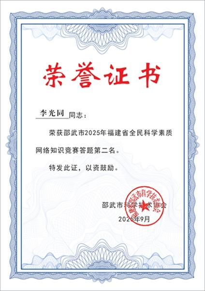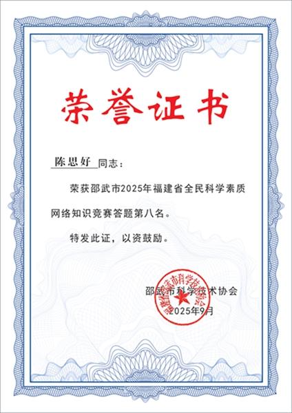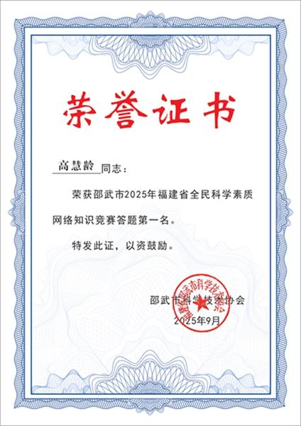 為深入貫徹習(xí)近平總書記關(guān)于科學(xué)普及和科學(xué)素質(zhì)建設(shè)工作的重要指示批示精神,落實(shí)《福建省“十四五”全民科學(xué)素質(zhì)行動(dòng)規(guī)劃綱要實(shí)施方案》,邵武市科協(xié)精心組織開展以“@邵武市2025年福建省全民科學(xué)素質(zhì)網(wǎng)絡(luò)競(jìng)賽火熱來襲!”為主題的網(wǎng)絡(luò)競(jìng)賽活動(dòng)。活動(dòng)期間,通過邵武融媒等官方公眾號(hào)全面發(fā)布競(jìng)賽規(guī)則、參賽指南、科普知識(shí)、參與方式及獎(jiǎng)勵(lì)機(jī)制,廣泛動(dòng)員市民參與。 本次競(jìng)賽歷時(shí)四個(gè)月,得到社會(huì)各界積極響應(yīng)與支持。為表彰先進(jìn)、激發(fā)全民學(xué)科學(xué)的熱情,根據(jù)競(jìng)賽規(guī)則評(píng)選出全市前100名優(yōu)秀參賽者,市科協(xié)將為其頒發(fā)榮譽(yù)證書及獎(jiǎng)品。現(xiàn)將競(jìng)賽前十名獲獎(jiǎng)人員予以公示展示: 1. 第一名: